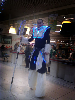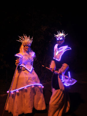 - Venez découvrir ces êtres venus d'une contrée lointaine. Perchés sur leurs échasses, la reine et ses deux guerriers illumineront vos déambulations et marchés de noël.